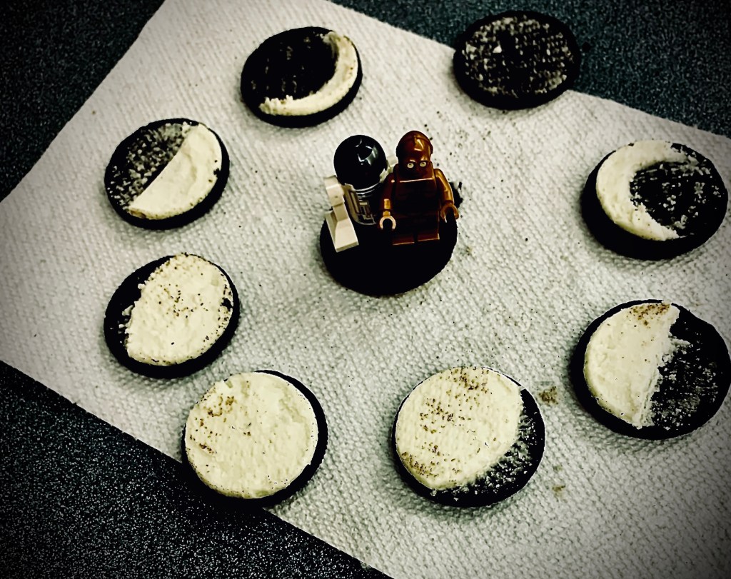 In the picture above, we used Oreo cookies to model the different phases of the moon. If the sun were located behind the cookie with no icing, and we are standing on Earth observing the moon as it rotates around Earth, you can see how the moon takes its different shape. When the Earth is between the sun and the moon, that is when we have a full moon. There are times when the Earth, moon and sun line up exactly and that is when we have eclipses. When the moon nears the full moon and goes away from it we have the gibbous moon, which is like a 3/4 moon. When the Moon is 90º from the sun and the Earth, we see the quarter moon. When the moon is between the Earth and the sun it is called a new moon. We cannot see it because the sun is so bright that it blocks out the moon. Just like the stars disappear when the sun is out. When it gets night out to where we can see the new moon, the moon is located on the other side of Earth between the sun. When the moon is nearing close and drawing away from a new moon we have the crescent moon.